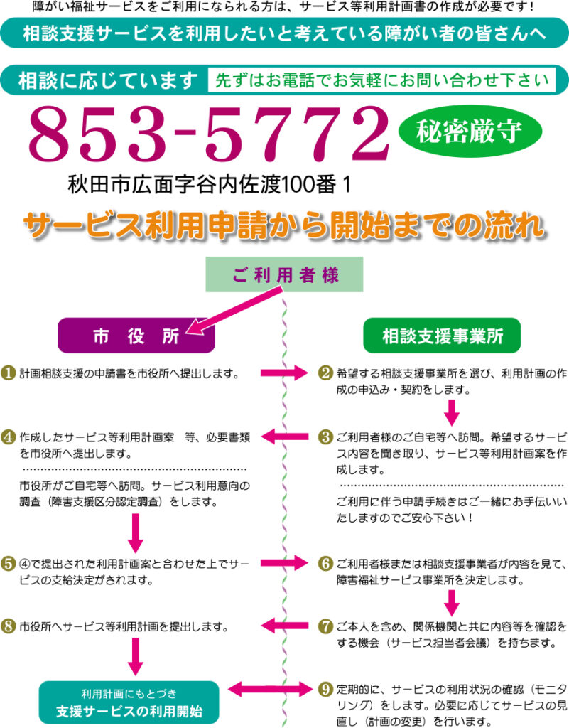●ご利用方法は、ご連絡の上ご来所いただくか、訪問にてご相談に応じます。