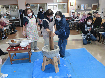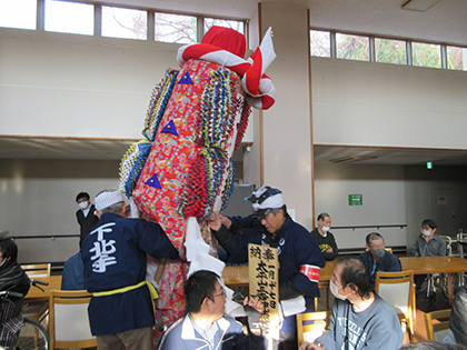 太平山三吉神社の梵天奉納前に下北手梵天会の方々が当施設に慰問に来てください ました。梵天に触れると縁起が良いとされ、利用者様の間を回って頂きホールいっぱいに「ジョヤサ、ジョヤサ」の掛け声が響き渡りました。また、「三吉節」の披露もありお祭り気分を味わうことができました。