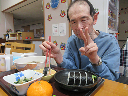利用者様、職員の無病息災を祈り、節分・恵方巻行事を行いました。職員扮する鬼へ、利用者様の年女・年男を中心に「鬼は~外!福は~内!」と元気な掛け声とともに豆を巻き、鬼を追い払いました。豆まき後は、恵方巻を西南西へ向き大きな口で「がぶり」、今年も健康で良い年になるように祈りながらいただきました。